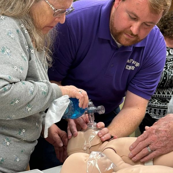 InHealth's Nursing Director, Trish Helgerson, RN/BSN, arranged for Frank Quinn, EMT/Firefighter and Mary Peters, EMT, of the LaFarge Fire and Rescue to provide clinic staff and volunteers with CPR training on October 27, 2025. 10 members participated. Pictured above are Tom and Deb Gilbertson with trainer, Frank Quinn.